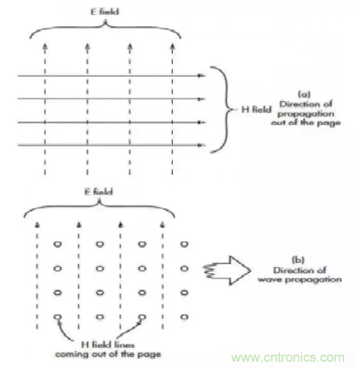 距離天線一定范圍內(nèi),電場(chǎng)和磁場(chǎng)基本為平面并以直角相交。注意傳播方向和電磁場(chǎng)均成直角。在圖2(a)中,傳播方向和電磁場(chǎng)線方向成正交,即垂直紙面向內(nèi)或向外。在圖2(b)中,磁場(chǎng)線垂直紙面向外,如圖中圓圈所示。