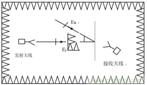 采用自由空間電壓駐波比法測(cè)量近場(chǎng)工作區(qū)反射電平,測(cè)量原理是基于微波暗室中存在有直射信號(hào)和反射信號(hào),微波暗室中空間任意一點(diǎn)的場(chǎng)強(qiáng)是直射信號(hào)和反射信號(hào)的矢量合,在空間形成駐波,駐波數(shù)值的大小就反映了微波暗室內(nèi)反射電平的大小。