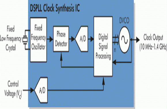 精密CMOS技術(shù)的進步提高了電路的速度和運算能力,廠商因此能以DSP為基礎(chǔ)發(fā)展出強大的頻率合成組件,并利用它們設(shè)計高頻率、低抖動的新型石英振蕩器和壓控石英振蕩器。這種把頻率合成組件與固定低頻率石英諧振器結(jié)合在一起的做法既可提供相當于傳統(tǒng)石英振蕩器或壓控石英振蕩器的功能,又可在使用者指定的多個頻率下操作。
