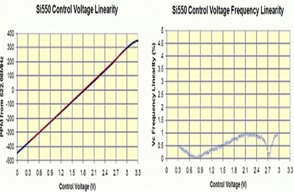 從圖4即可看出在控制電壓的線性方面,以DSPLL為基礎(chǔ)的振蕩器比現(xiàn)有的壓控石英振蕩器或壓控SAW振蕩器還好五倍。Si550會將控制電壓數(shù)字化,然后傳給DSPLL頻率合成引擎。這種做法可以免除傳統(tǒng)所需的變?nèi)萜骱退鶐淼姆蔷€性特性,進而提供高于其它競爭組件五到十倍的±1線性效能。Si550還提供多種控制范圍(tuning range)讓客戶選擇最適合其應(yīng)用的組件;相較于采用SAW的解決方案,這種可選擇式控制斜率范圍在同樣的溫度范圍內(nèi)可以提供更穩(wěn)定的回路頻寬,進而使得設(shè)計更強固可靠。