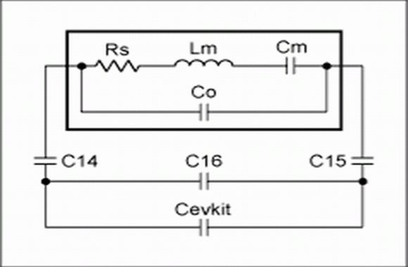 串聯(lián)牽引電容會加快晶體振蕩,而并聯(lián)電容會減緩振蕩。Cevkit為5pF,如果使用負(fù)載電容為5pF的晶體,會振蕩到需要的頻率上,因而無需外部的電容(C16不接,同時C14和C15在板上短接)。評估板本身使用3pF負(fù)載電容的晶體,需要兩個15pF電容串聯(lián)加速振蕩。負(fù)載電容的計算如下: