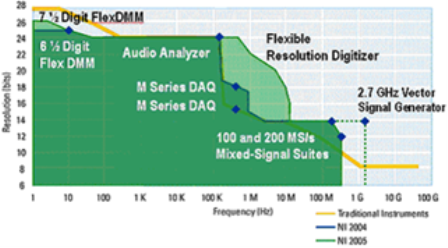 基本上,虛擬儀器系統(tǒng)是基于軟件的,所以如果只要是可以數(shù)字化的東西,就可以對它進行測量。因此,測量硬件可在通過兩根坐標軸進行評估,即分辨率(位)和頻率。參考下圖可以看出虛擬儀器硬件測量性能與傳統(tǒng)儀器的比較。NI的目標就是將曲線在頻率和分辨率上延伸并且在曲線內(nèi)進行不斷推陳出新。
