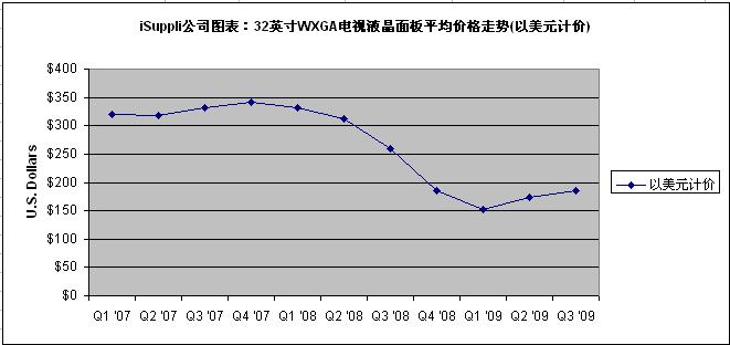 附圖所示為iSuppli公司對(duì)于2008年10月至2009年第四季度結(jié)束時(shí)32英寸WXGA TV LCD面板市場(chǎng)的價(jià)格預(yù)估。這種面板價(jià)格可以體現(xiàn)出整體市場(chǎng)趨勢(shì)。
