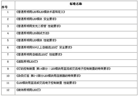 標(biāo)準(zhǔn)的目的在于加強生產(chǎn)的一致性、提升質(zhì)量、并增進(jìn)生產(chǎn)效率,若欲提升LED的制造質(zhì)量,在全球化的競爭脫穎而出,標(biāo)準(zhǔn)是一項不可或缺的工具,因此加速對LED標(biāo)準(zhǔn)的制定是各國政府及業(yè)界非常重視的問題。2007年在半導(dǎo)體照明標(biāo)準(zhǔn)工作指導(dǎo)委員會的指導(dǎo)下,由“國家半導(dǎo)體照明工程研發(fā)及產(chǎn)業(yè)聯(lián)盟”成立“聯(lián)盟標(biāo)準(zhǔn)化協(xié)調(diào)推進(jìn)工作組”,以負(fù)責(zé)協(xié)調(diào)中國的LED標(biāo)準(zhǔn)進(jìn)度。而目前最新進(jìn)展是由“全國照明電器標(biāo)準(zhǔn)化技術(shù)委員會”提出的普通照明用LED國家標(biāo)準(zhǔn)及行業(yè)標(biāo)準(zhǔn)等10多項標(biāo)準(zhǔn)目前都在送審階段,預(yù)計于今年陸續(xù)頒布實施,如表所示。