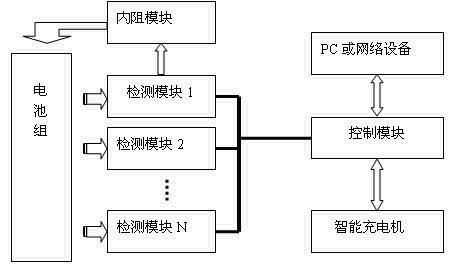 如圖3-1所示,裝置由控制模塊、檢測模塊、內(nèi)阻模塊、相關(guān)軟件和輔助部件構(gòu)成,一個控制模塊可接入多個檢測模塊,完成對不同只數(shù)和不同電壓規(guī)格的蓄電池組的監(jiān)測管理,可同時(shí)管理多組蓄電池。