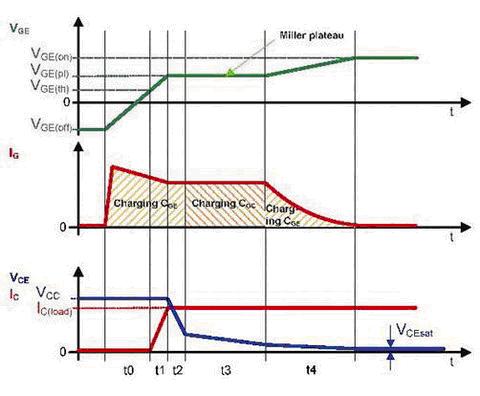 正如IG=f(t)圖所示,導(dǎo)通過程可以分為三個(gè)階段。分別是柵極-發(fā)射極電容的充電,柵極-集電極電容的充電和柵極-發(fā)射極電容的充電直至IGBT全飽和。柵極電流IG對(duì)輸入電容進(jìn)行充電,IGBT的導(dǎo)通和關(guān)斷特性由與充電過程有關(guān)的電壓VGE和VCE來體現(xiàn)。在關(guān)斷期間,所描述的過程運(yùn)行在相反的方向,電荷必須從柵極上移除。
