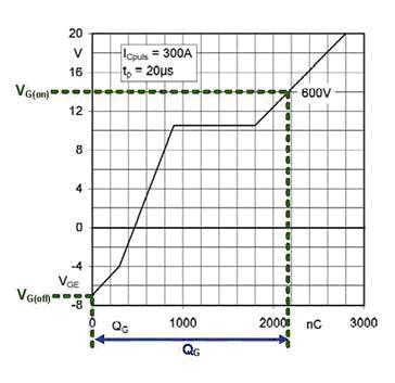 柵極電荷可以通過一個(gè)簡化的測試電路進(jìn)行測量。當(dāng)柵極電壓VGE用示波器進(jìn)行測量時(shí),柵極由一個(gè)恒流源(QG=I*t)驅(qū)動(dòng)。所確定的柵極電荷曲線(圖3)可被用來計(jì)算驅(qū)動(dòng)IGBT所需的每脈沖柵極電荷。