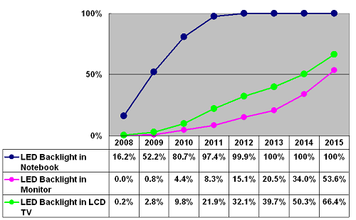 同時,2013年采用LED背光的大尺寸(指10寸及以上尺寸)面板出貨量將從2009年約8千490萬片成長到4億3千480萬片,將占LED背光市占率估計為54.3%,LED背光將成為市場主流規(guī)格。其中notebook PC將是LED背光主要應(yīng)用,依據(jù)DisplaySearch分析到了2012年百分之百notebook PC都將采用LED背光。