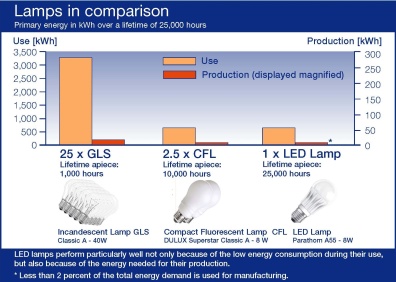 此次研究是與西門子研究院生態(tài)創(chuàng)新中心 (Siemens Corporate Technology, Centre for Eco Innovations) 的專家合作進行的。研究結(jié)果表明,LED 燈與緊湊型熒光燈相似,也是將超過 98% 的能耗用于發(fā)光,只有不到 2% 的能耗用于生產(chǎn),這就打消了人們認為生產(chǎn)LED 可能特別耗費能源的擔憂。白熾燈的一次能源消耗為 3,300 kWh 左右,而 LED 燈的一次能源消耗不到 700 kWh,因此,LED 燈顯然比傳統(tǒng)白熾燈更高效。除此之外,該評估結(jié)果還表明,LED 燈在整個生命周期中對環(huán)境的影響始終優(yōu)于白熾燈。