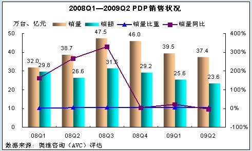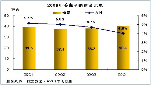 奧維咨詢(AVC)數(shù)據(jù)表明:2009年上半年等離子彩電國(guó)內(nèi)市場(chǎng)零售量規(guī)模為76.8萬(wàn)臺(tái)、占整體彩電市場(chǎng)的5.1%,零售額規(guī)模為49.2億元,占整體彩電市場(chǎng)的9.1%,分別較去年同期相比變化8.8%、-12.8%。
