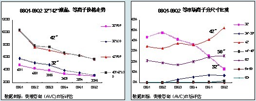 在以上雙重因素的作用下,等離子市場(chǎng)32、42和50英寸產(chǎn)品三足鼎立的局勢(shì)被打破,出現(xiàn)了42英寸占據(jù)半壁江山的局面。據(jù)奧維咨詢(AVC)數(shù)據(jù)顯示:32英寸產(chǎn)品比重已由08Q1的43.4%跌至09Q2的13.0%,而42英寸產(chǎn)品則由34.7%攀升至52.4%。