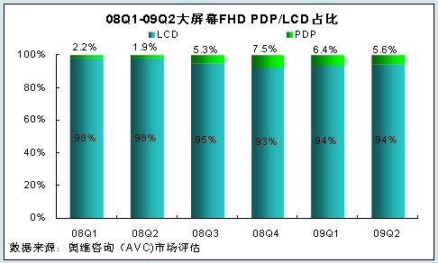 - 2009年上半40英寸以上等離子在大屏幕FHD市場(chǎng)占有率6.0%,同比增加4.0%
