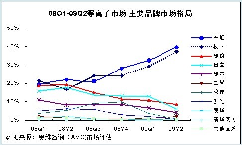 由于部分企業(yè)逐漸退出等離子市場(chǎng),長(zhǎng)虹和松下兩大品牌的市場(chǎng)集中度日益上升。進(jìn)入2009年以來(lái),在長(zhǎng)虹等離子生產(chǎn)線正式投入量產(chǎn)的推動(dòng)下,這一趨勢(shì)愈加明顯。據(jù)奧維咨詢(AVC)數(shù)據(jù)顯示:2009年上半年等離子市場(chǎng)長(zhǎng)虹的市場(chǎng)占有率達(dá)35.4%,松下占有率為32.4%,長(zhǎng)虹、松下兩大品牌的占有率達(dá)到67.8%,已經(jīng)形成了絕對(duì)的寡頭壟斷現(xiàn)象。