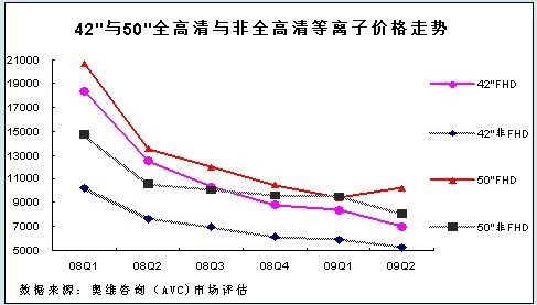 奧維咨詢(AVC)數(shù)據(jù)顯示:2009年上半年40英寸以上全高清等離子彩電在等離子整體市場(chǎng)占有率為24.6%,比去年同期增加了20.6%。大屏幕全高清等離子市場(chǎng)的高速增長(zhǎng),得益于其產(chǎn)品價(jià)格的下降和相對(duì)于非全高清產(chǎn)品的價(jià)格差距越來(lái)越小,替代不可避免。
