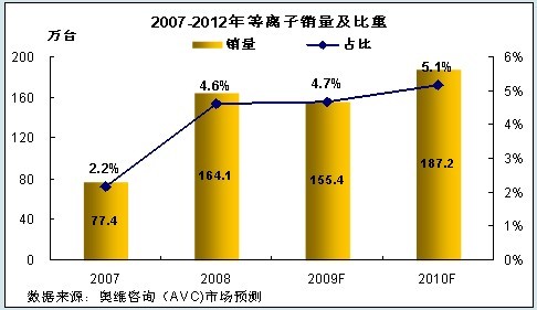 考慮到未來(lái)平板電視市場(chǎng)的走勢(shì)、結(jié)合等離子上下游產(chǎn)業(yè)情況,奧維咨詢(AVC)預(yù)測(cè):2009年全年等離子銷量為155.4萬(wàn)臺(tái),與2008年的總量基本持平。2009年下半年,受液晶市場(chǎng)的規(guī)模優(yōu)勢(shì)擠壓,第三、四季度等離子電視的銷量因彩電旺季到來(lái)將上升至78.6萬(wàn)臺(tái),但占市場(chǎng)比重將下降至4.3%。