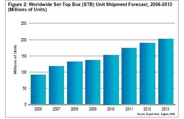 圖2所示為iSuppli公司對于2006-2013年全球STB出貨量的預(yù)測(單位:百萬臺)