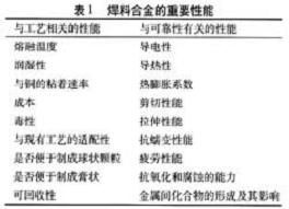 微電子領(lǐng)域使用的焊料有著很嚴(yán)格的性能要求,無(wú)鉛焊料也不例外,不僅包括電學(xué)和力學(xué)性能,還必須具有理想的熔融溫度。從制造工藝和可靠性兩方面考慮,表1列出了焊料合金的一些重要性能。