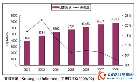 由于需求減緩,難以消耗年初所擴增產能,導致產品單價巨幅的向下變動,整體市場景氣由繁榮轉為衰退,所幸上半年市場成長,抵銷部分下半年市場衰退負面影響,2008年全球LED市場較2007年微幅成長3%,達67.6億美元,詳如圖一所示。