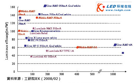 2001年標準型白光LED(20mA)發(fā)光效率僅25lm/W,至2009年初Nichia發(fā)表之白光LED,在20mA電流下,其發(fā)光效率可達249lm/W,為目前業(yè)界之最。高功率白光LED(350mA)發(fā)光效率也由2004年約30 lm/W,截至2008年年底Cree發(fā)表161lm/W產品為業(yè)界之最。