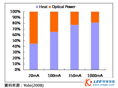 不同驅動電流下,LED光熱輸出比