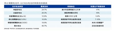 從成本來(lái)看,中投證券認(rèn)為,盡管晶體硅價(jià)格暴跌,CIGS仍具成本優(yōu)勢(shì)。首先,由于CIGS電池尚未達(dá)到量產(chǎn),通過(guò)成本細(xì)拆,參照工藝類(lèi)似的第一太陽(yáng)能的成本構(gòu)成(主要是設(shè)備折舊、玻璃、材料和人工等四項(xiàng)),在規(guī)模化效應(yīng)下,CIGS薄膜電池的成本約為1.07美元/瓦,已遠(yuǎn)低于目前的晶體硅電池成本。其次,CIGS電池采用相對(duì)廉價(jià)的玻璃為襯底,這樣所需的稀有元素耗損量大為減少;另外,CIGS電池的弱光效應(yīng)較好,對(duì)光照的要求降低,運(yùn)行時(shí)間遠(yuǎn)高于晶體硅電池。