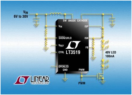 LT3519 在 LED 的高端檢測輸出電流,從而可實現(xiàn)降壓、降壓-升壓或升壓型配置。結(jié)合傳統(tǒng)電壓反饋和獨特的浮動電流檢測反饋,這些轉(zhuǎn)換器可以作為恒定電壓或恒定電流源工作,從而提供最大的設(shè)計靈活性。其它特點包括:開路 LED 保護(hù)、軟啟動和熱保護(hù)。
