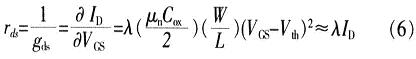 式中,γ是體效應(yīng)參數(shù),|2φF|為表面反轉(zhuǎn)電勢。圖2中,電阻rds表示有限輸出阻抗,模擬溝道長度調(diào)節(jié)和漏極電流因Vds改變而引起的效應(yīng),由式(1)可得: