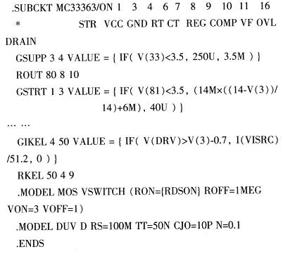 語句GSUPP34VALUE={IF(V(33)<3.5,250U,3.5M)},表示節(jié)點33和節(jié)點3、4之間連接的模塊實現(xiàn)當(dāng)輸入端33節(jié)點的電壓小于3.5V時,輸出端節(jié)點3和節(jié)點4之間的電壓為250μF,否則為3.5mV。該網(wǎng)格表使用到的EVALUE和GVALUE器件是將輸出量和輸入量之間運算函數(shù)關(guān)系用語句表示。EVALUE和GVALUE稱為模擬行為模型(ABM)器件,除了這兩個外還有:*SUM、*MULT、*TABLE、ABS、LOG等,帶有“*”符號的元器件,有E、G兩種類型。使用ABM器件可省去實現(xiàn)這些換算的電路,簡化子電路建模的工作量。