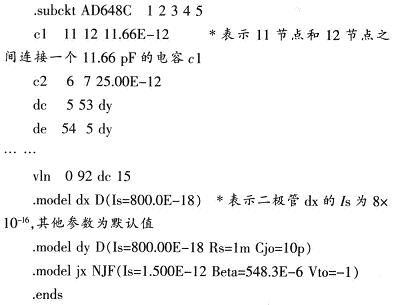 將此種的文本文件存為.lib的后綴名后,通過ModelEditor工具將該文件與器件符號聯(lián)系在一起,就可以使用在電路仿真中。圖5為AD648C的簡單運用電路,從圖6瞬態(tài)分析結(jié)果可知建模正確。