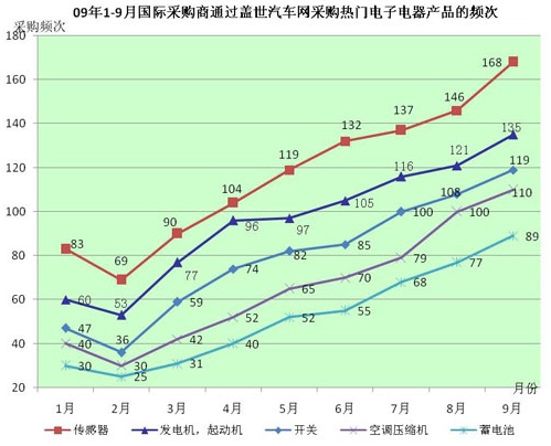 與此相對應(yīng),據(jù)全球領(lǐng)先的專業(yè)汽車零部件電子商務(wù)平臺—蓋世汽車網(wǎng)的統(tǒng)計數(shù)據(jù)顯示,09年2-9月,國際采購商通過蓋世汽車網(wǎng)采購的汽車電子電器產(chǎn)品均呈現(xiàn)出大幅度增長之勢(如下圖所示)。其中,熱門采購產(chǎn)品主要有傳感器、發(fā)電機/起動機、開關(guān)、空調(diào)壓縮機、蓄電池等,平均每月采購頻次分別為120、100、82、 68、54以上。與2月份相比,9月份熱門采購產(chǎn)品的采購量增長幅度均達2-3倍。