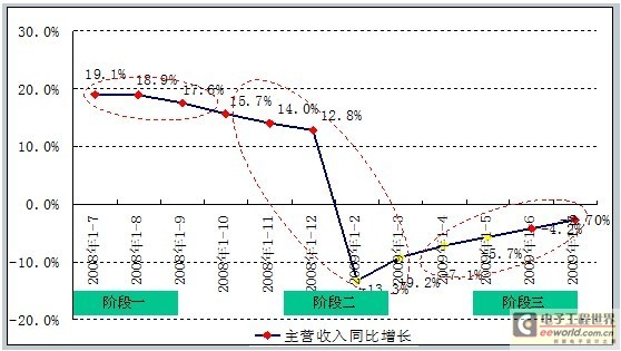 2008年三季度,受全球金融危機(jī)的影響,中國電子信息產(chǎn)業(yè)出現(xiàn)下滑趨勢。7-8月,主營收入增長率下滑0.2個百分點(diǎn),8-9月,增長率下滑1.3個百分點(diǎn)。進(jìn)入第四季度,下滑幅度開始增大,9-10月,增長率下滑了1.9個百分點(diǎn),至2009年2月,主營收入增長率跌至最低點(diǎn)。從2009年2月電子信息產(chǎn)業(yè)振興規(guī)劃獲得通過,4月振興規(guī)劃正式發(fā)布到7月期間,伴隨著“家電下鄉(xiāng)”,“汽車下鄉(xiāng)”、調(diào)整出口退稅稅率等政策相繼實(shí)施,振興規(guī)劃對電子信息產(chǎn)業(yè)的提振效應(yīng)開始顯現(xiàn)。賽迪顧問研究數(shù)據(jù)顯示,從2009年4月起,電子信息產(chǎn)業(yè)經(jīng)濟(jì)運(yùn)行開始出現(xiàn)企穩(wěn)跡象,主營收入降幅趨緩,并逐漸開始走出低谷。