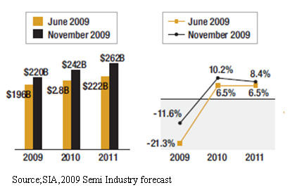 然而最新的預測調(diào)整為2009年全球半導體業(yè)僅下降11.6%,為2197億美元,但是對于2010年修正為增長10.2%,達2421億美元,及2011年增長8.4%,達2623億美元。