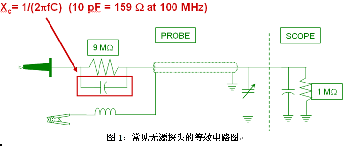 從無源探頭的原理來看,如圖1所示為常見的無源探頭的簡(jiǎn)化電路圖,通常示波器標(biāo)配的無源探頭的直流輸入電阻為10兆歐(探頭的9兆歐與示波器前端1兆歐串聯(lián)),輸入電容為10pf左右,與9兆歐電阻并聯(lián)。當(dāng)待測(cè)試信號(hào)的頻率較高時(shí),容抗隨著頻率升高而減小,所以無源探頭整體的輸入阻抗變小,當(dāng)頻率為100MHz時(shí),輸入阻抗為159歐。