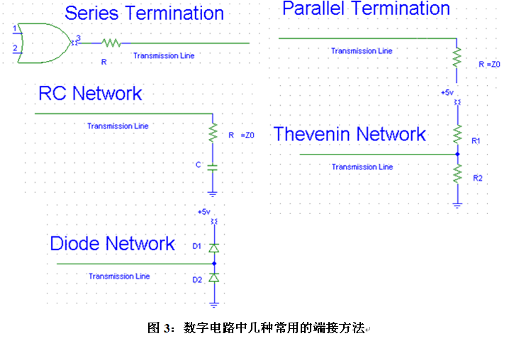 盡管并聯(lián)了100歐電阻后電路板能正常工作了,但是接收端測(cè)量到的峰峰值高達(dá)6.2V,對(duì)于SDRAM芯片3.3V的工作電壓來講還是比較大的,長(zhǎng)期工作可能會(huì)導(dǎo)致內(nèi)存芯片出問題,所以,我們還需改進(jìn)端接策略。在信號(hào)完整性書籍中,通常有串聯(lián)匹配、并聯(lián)匹配、RC網(wǎng)絡(luò)、戴維南網(wǎng)絡(luò)等端接方法,如下圖3所示。相比并聯(lián)匹配,串聯(lián)匹配不用提供DC電流到地或者電源,不會(huì)對(duì)輸出的高低電平產(chǎn)生影響,能減小過沖和EMI,所以我們接著嘗試串聯(lián)匹配下的信號(hào)質(zhì)量。
