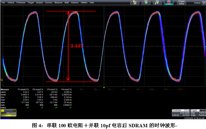 由于電路中ARM的MCU輸出的一路100MHz時(shí)鐘要驅(qū)動(dòng)兩個(gè)SDRAM芯片,布線上MCU出來的時(shí)鐘剛出來就分成兩路后連向兩個(gè)SDRAM的時(shí)鐘引腳,所以我們采用了在兩路時(shí)鐘分支上同時(shí)串聯(lián)100歐電阻加并聯(lián)10pf電容的端接方法。在PCB上割線,焊上電阻和電容后測(cè)量的結(jié)果如下圖4所示,改進(jìn)后的時(shí)鐘峰峰值為3.44V,波形無過沖,信號(hào)質(zhì)量良好。電路板系統(tǒng)運(yùn)行正常。