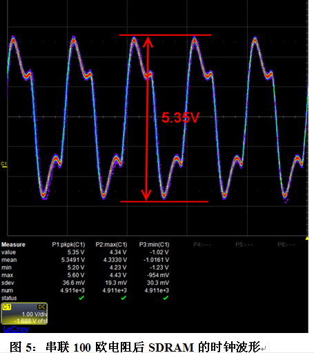 下圖5所示為只串聯(lián)100歐電阻時(shí)測(cè)量到的波形,信號(hào)有過沖,峰峰值為5.35V,偏大,對(duì)比圖4的端接方法,串聯(lián)電阻加上并聯(lián)電容是較好的解決方法。