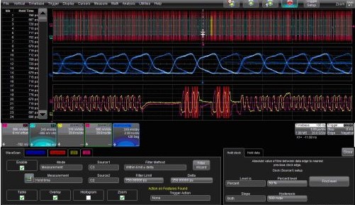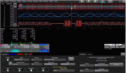 力科的WaveScan波形搜索與掃描特性可以通過選擇Strobe和掃描疊加(ScanOverlay)圖中滿足條件的波形之間的時(shí)序關(guān)系找出Data信號(hào)。圖2是這種功能的一個(gè)例子。WaveScan的對(duì)話框設(shè)置為搜索建立時(shí)間(Hold Time)在500ps到1ns(750 ±250 ps)之間的波形。對(duì)話框右邊的標(biāo)簽用來鑒別Strobe和Data信號(hào)。注意“Hold Clock”和“Hold Data”兩個(gè)對(duì)話框標(biāo)簽,測(cè)量是對(duì)這兩個(gè)信號(hào)邊沿設(shè)定的。