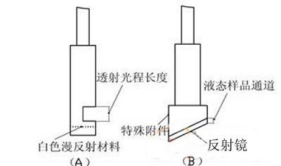 圖4-A是透射式浸入探頭,在探頭末端有一段1mm、2.5mm或5mm的缺口,光通過此物理間隙由底部的白色漫反射材料反射回連接到光譜儀的光纖,信號進入儀器內(nèi)進行檢測。通過把探頭浸入或固定在液體中,可在線測量吸收率。圖4-B是工業(yè)用熒光探頭,它在反射式探頭末端加裝特殊的附件,變?yōu)橐粋€45。角的前端視窗,該附件可有效防止周圍環(huán)境光進入探頭,并屏蔽激發(fā)光來增強熒光信號。被測液體光程還可在0-5mm之間調(diào)節(jié)。