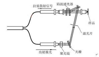 由于拉曼散射信號較弱,受干擾影響大,故用于拉曼光譜測量的光纖探頭光路設計較為特別(圖5所示)。