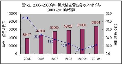 據(jù)工業(yè)和信息化部運行監(jiān)測協(xié)調(diào)局統(tǒng)計,今年1~9月份,中國大陸電子制造業(yè)主營業(yè)務收入35,285億元,同比增長-1.8%;從1月份的-15%收窄到9月份的-1.8%,平均每月收窄1.65個百分點。據(jù)此平均值推算,并考慮到第四季度一般要好于前三個季度的情況,規(guī)模以上電子信息制造業(yè)主營業(yè)務收入,將在10月份接近去年的同期水平,到今年年底,制造業(yè)主營業(yè)務收入應能回升到3.2%,達到52,892億元(見圖1)。據(jù)工業(yè)和信息化部運行監(jiān)測協(xié)調(diào)局統(tǒng)計,今年1~9月份軟件業(yè)收入6775億元,同比增長20.3%,。如能繼續(xù)保持20%左右的增長,今年的軟件收入可達9,088億元。則2009年電子信息行業(yè)的總營業(yè)額將達到61,980億元(約折合9,115億美元),總營業(yè)額將比2008年增長5.4%。預計2010年,在國際經(jīng)濟回暖和繼續(xù)擴大內(nèi)需的推動下,中國大陸電子信息產(chǎn)業(yè)主營業(yè)務總收入將實現(xiàn)11.2%左右的增長,達到68,904億元(約折合10,133億美元)(見圖2)。