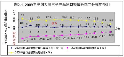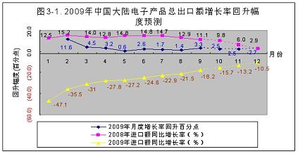 2008年下半年,國際金融風暴席卷全球,以出口為主導的中國大陸電子信息產(chǎn)業(yè)直接受到?jīng)_擊,產(chǎn)品進出口受阻,導致產(chǎn)品產(chǎn)量不斷下降,到今年元月份下降到谷底。由于中國政府及時實行積極的財政政策,調(diào)整產(chǎn)品結(jié)構,努力擴大內(nèi)需,電子信息產(chǎn)業(yè)從2月份開始逐漸回升。雖然在個別月份有所波動,但回升趨勢穩(wěn)定向好。預計2009年全行業(yè)能實現(xiàn)5%左右的增長;進出口額雖然有較大幅度的回升,但仍將呈現(xiàn)負增長;由于政府積極擴大內(nèi)需,國內(nèi)市場將繼續(xù)保持10%左右的較快增長。