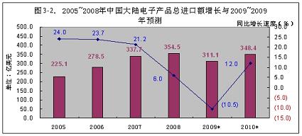 根據(jù)國家海關總署提供的數(shù)據(jù)分析,今年1~9月份電子產(chǎn)品進口總額為3,017.6億美元,同比下降18.2%,比元月份回升了28.9個百分點。按每月進口額回升幅度的平均值(2.5個百分點)推算,今年總進口額下降速度應回升到-10.5%,達到3,111億美元(見圖3-1)。中國大陸進口的主要電子產(chǎn)品是電子元器件和技術設備,預計2010年,在電子整機出口回升和國內(nèi)需求增長的驅(qū)動下,總進口額將達到或超過2008年的3,476美元水平(見圖3-2)。