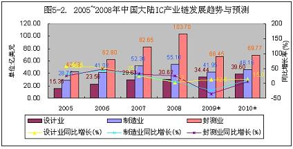 據(jù)中國半導體行業(yè)協(xié)會統(tǒng)計,今年1~9月份IC設計業(yè)、制造業(yè)和封裝業(yè)的銷售收入分別比2008年增長10.2%、-25.4%和-37.2%,制造業(yè)和封裝業(yè)下降幅度較大。預計2010年會隨著國內(nèi)經(jīng)濟和出口形勢的好轉(zhuǎn),將逐步回升到小幅度正增長(見圖5-1、5-2)。