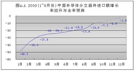 今年1~9月份,半導體分立器件進口額增長率回升明顯。從元月份的-48.2%,回升到9月份的-10.0%,共回升了38.2個百分點。按此回升速度,到今年年底可回升到-1.9%(見圖6-3)。