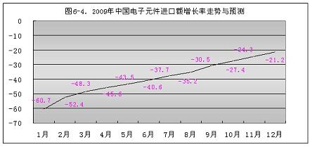 今年元月份,電子組件進口額增長率跌幅最大,達到-60.7%。回升速度也慢。到9月份回升到-30.5%,共回升了30.2個百分點。按此回升速度,到今年年底可回升到-21.2%(見圖6-4)。所以今年電子組件進口額呈現(xiàn)負增長已成定局。其主要原因,除整機出口的影響外,是近幾年國內(nèi)電子組件供應份額的不斷擴大。