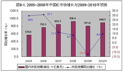 2009年,受國際金融危機影響,電子產(chǎn)品出口受阻,整機產(chǎn)量有所下降,國內(nèi)集成電路的需求規(guī)模,同2008年相比將下降12.4%,約為811億美元(見圖8-1)。其中,90%左右仍靠進口。