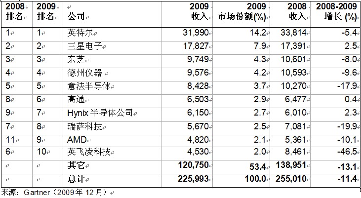 盡管收入下滑,英特爾公司連續(xù)18年來(lái)收入蟬聯(lián)首位。2009年,該公司的市場(chǎng)份額增加到14.2%。