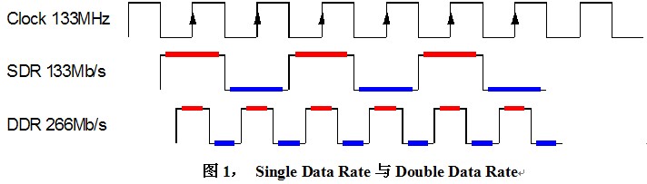 內(nèi)存技術(shù)從SDR,DDR,DDR2,DDR3一路發(fā)展而來(lái),傳輸速度以指數(shù)遞增,除了晶圓制造工藝的提升因素之外,還因?yàn)椴捎昧薉ouble Data Rate以及Prefetch兩項(xiàng)技術(shù)。實(shí)際上,無(wú)論是SDR還是DDR或DDR2、3,內(nèi)存芯片內(nèi)部的核心時(shí)鐘基本上是保持一致的,都是100MHz到200MHz(某些廠(chǎng)商生產(chǎn)的超頻內(nèi)存除外)。DDR即Double Data Rate技術(shù)使數(shù)據(jù)傳輸速度較SDR提升了一倍。如下圖所示,SDR僅在時(shí)鐘的上升沿傳輸數(shù)據(jù),而DDR在時(shí)鐘信號(hào)上、下沿同時(shí)傳輸數(shù)據(jù)。例如同為133MHz時(shí)鐘,DDR卻可以達(dá)到266Mb/s的數(shù)傳速度。