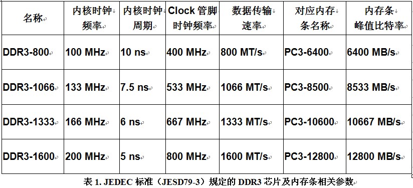下表列出了JEDEC標(biāo)準(zhǔn)(JESD79-3)規(guī)定的DDR3芯片及內(nèi)存條相關(guān)參數(shù)。需要說(shuō)明的是,如前所述,并不是所有的內(nèi)存產(chǎn)品都完全遵從JEDEC標(biāo)準(zhǔn),有些廠(chǎng)商會(huì)生產(chǎn)速度更高速的DDR3芯片,一般情況下這些芯片是從芯片檢測(cè)流程中篩選出來(lái)的頻率動(dòng)態(tài)范圍更大的芯片,或者是可加壓超頻工作的芯片。