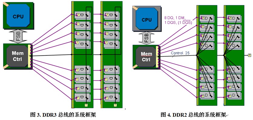 在系統(tǒng)設(shè)計(jì)方面DDR3與DDR2最大的區(qū)別在于DDR3將時(shí)鐘、地址及控制信號(hào)線(xiàn)的終端電阻從計(jì)算機(jī)主板移至內(nèi)存條上,這樣一來(lái)在主板上將不需要任何端接電阻。為了盡可能減小信號(hào)反射,在內(nèi)存條上包括時(shí)鐘線(xiàn)在內(nèi)的所有控制線(xiàn)均采用Fly-by拓?fù)浣Y(jié)構(gòu)。同時(shí),也是因?yàn)镕ly-by的走線(xiàn)結(jié)構(gòu)致使控制信號(hào)線(xiàn)到達(dá)每顆內(nèi)存顆粒的長(zhǎng)度不同從而導(dǎo)致信號(hào)到達(dá)時(shí)間不一致。這種情況將會(huì)影響內(nèi)存的讀寫(xiě)過(guò)程,例如在讀操作時(shí),由于從內(nèi)存控制器發(fā)出的讀命令傳送到每顆內(nèi)存芯片的時(shí)間點(diǎn)不同,將導(dǎo)致每顆內(nèi)存芯片在不同的時(shí)間向控制器發(fā)送數(shù)據(jù)。為了消除這種影響,需要在對(duì)內(nèi)存進(jìn)行讀寫(xiě)等操作時(shí)對(duì)時(shí)間做補(bǔ)償,這部分工作將由內(nèi)存控制器完成。DDR3總線(xiàn)的系統(tǒng)框架如下圖所示,其中紅線(xiàn)代表DQ、DM以及差分DQS信號(hào)線(xiàn),黑線(xiàn)代表時(shí)鐘、地址及控制信號(hào)線(xiàn),T代表相應(yīng)的端接電阻。